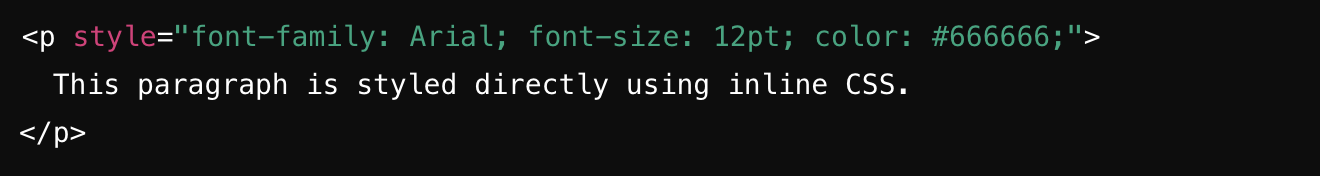 In this next example, the style attribute is used within the <p> tag to apply CSS properties directly to that paragraph. This method allows you to set styles directly on individual elements, but it’s typically best used for quick, specific changes rather than for extensive styling.